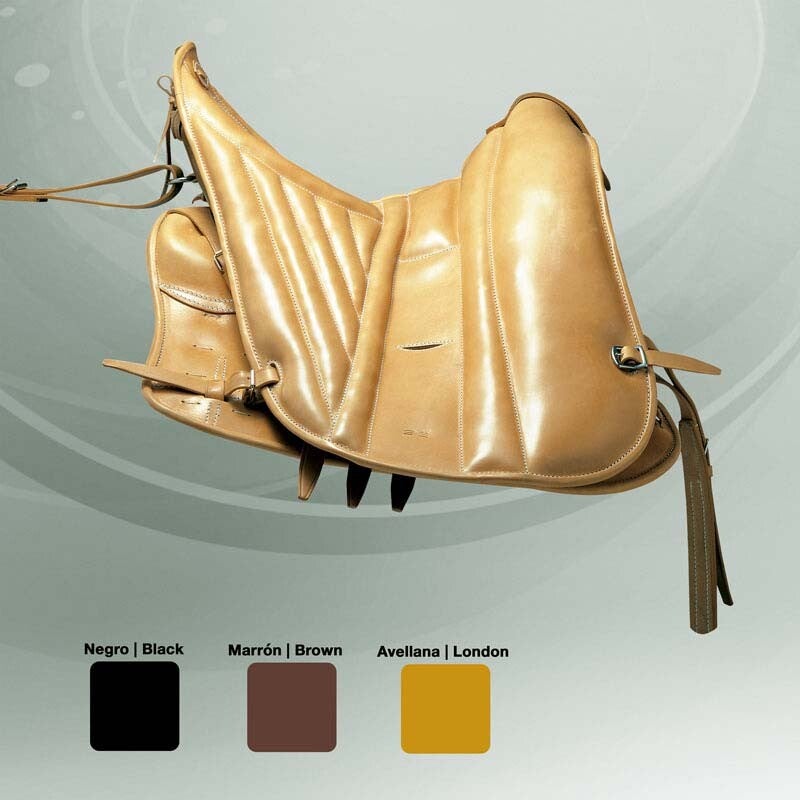 Asiento de goma látex. Faldón unido al asiento de una sola pieza. Baste relleno de lana. Armadura fabricada en materiales especiales, con la tecnología más avanzada. Garantía de 10 años. Estriberas inoxidables de cuadradillo. Latiguillos cortos.