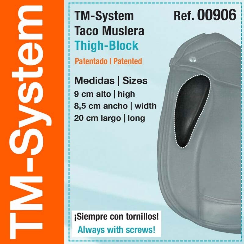 Combi Tm3, nuevo Sistema de Intercambio de taco-muslera a otras 2 rodilleras opcionales, con tecnología TM de ajuste por tornillos al faldón, patentado por Zaldi Sillas de Montar.