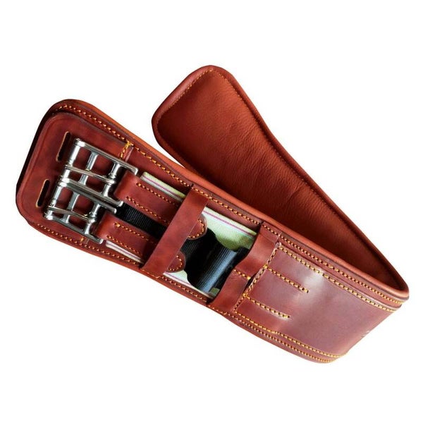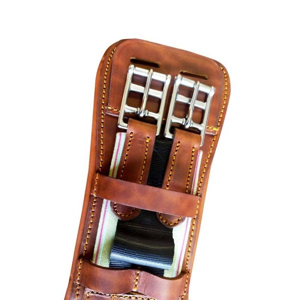 Cincha de doma de cuero y acolchada para proporcionar una máxima comodidad al caballo.